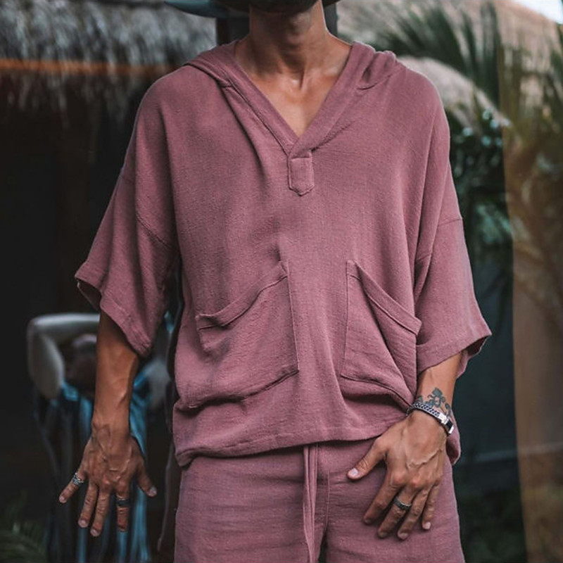 Men's Linen Set Shorts and T Shirt Set 2 Pieces Outfits Short Sleeve Hooded Summer Solid Color Beach Wear Casual 2 Piece Front Pocket Vacation Casual Black Pink White Top Tee for Men