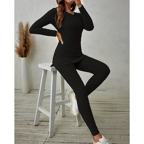 Per donna Moda Essenziale Set da due pezzi Maglietta Set di Pantaloni Manica Lunga Scollo a V Tinta unica Casuale Quotidiano Lavoro Nero Bianco Verde militare Primavera Taglia piccola