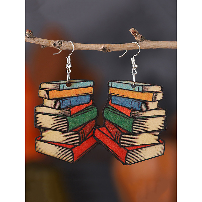 Women's Colorful Book Stack Earrings - Lightweight Wooden Pendant Jewelry for Teachers, Students, Book Lovers - Fun Back to School or Graduation Gift