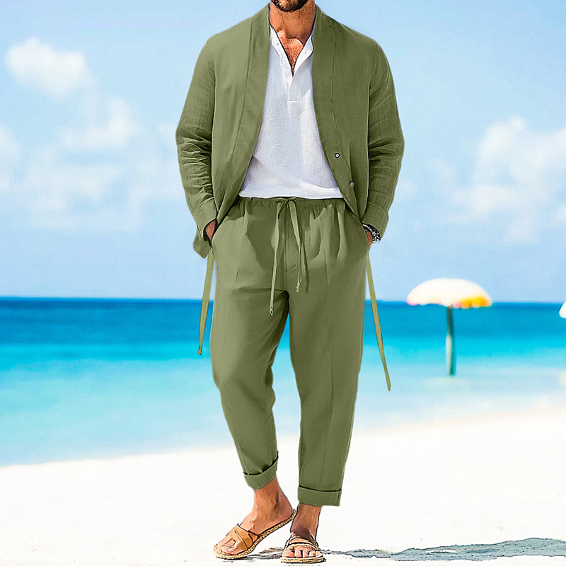 Men's 2 Piece Shirt Set Matching Sets Casual Shirt Plain Daily Going out Black Light Grey Army Green Dark Gray Long Sleeve Collarless Spring Summer Clothing Apparel Elastic Waistband