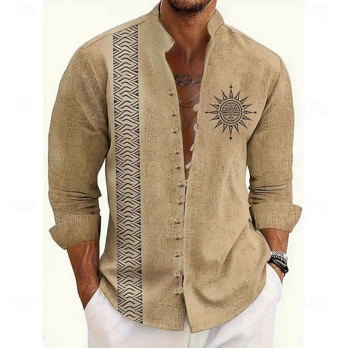 Herren Sonne Ethnisch Indische Kultur Hemd Stehkragenhemd Langarm Vintage-Retro Lässig Urlaub Frühling Herbst Mandarinkragen Stehkragen Button-Down Leinenähnliches Hemd Blau Grün Khaki Grau