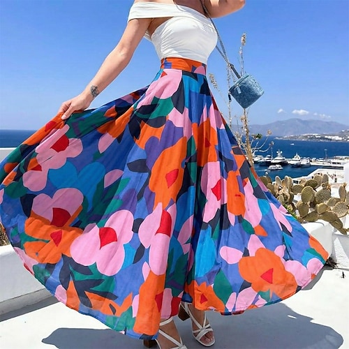 Per donna Gonna da vacanza Elegante Vintage Moda Casual Maxi Vita Alta Gonne Floreale Grafico Arricciato Stampato Inelastico Quotidiano Spiaggia Blu Bianco Estate 100% Poliestere