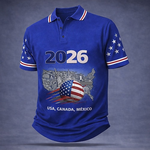 Fußball-Pokal 2026 Herren Fußball Poloshirts Kurzarm Polo-Shirts Hemden mit Kragen Lässig Athleisure 3D-Druck Knöpfe Sommer Frühling Blau Weiß Rote