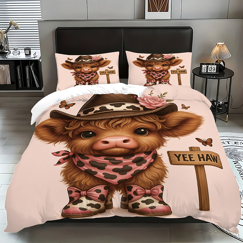 Cute Floral Highland Cow 3-Piece Down Duvet Cover Set for Large Bed, Soft Short Plush Comforter Cover with 2 Pillowcases – Hotel Bedroom Bedding, Cozy Comfortable