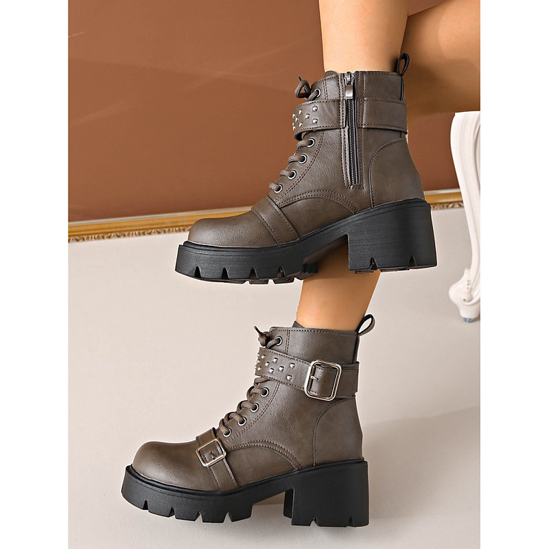 Women's Boots Combat Boots Daily Booties Ankle Boots Lace-up Chunky Heel Round Toe Casual Faux Leather Zipper Light Brown Black Gray