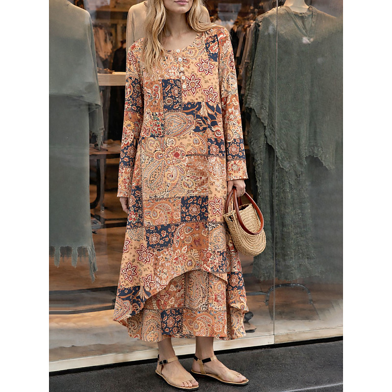 Women's Midi Dress Shift Dress A Line Dress Casual Holiday Regular Fit Graphic Paisley Long Sleeve Crew Neck Yellow Orange Beige Spring Fall Winter