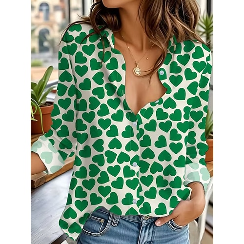 camicetta da donna portafortuna per il giorno di San Patrizio, grafica, trifoglio, vintage, elegante, casual, manica lunga, colletto, top normali, da lavoro quotidiano, bottoni, stampa, bianco, verde