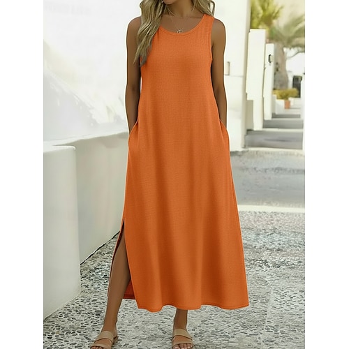 Per donna Abito maxi Abito in lino Vintage Classico Quotidiano Vacanza Vestibilità comoda Colore Puro Senza Maniche Girocollo Blu turchese Arancione Verde Turchese Estate