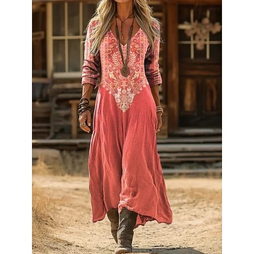 Per donna Abito maxi Vestito Estivo Abito Estivo Vacanza Casual Boho Quotidiano Vestibilità comoda Grafico Blocco di colori Etnico Manica Lunga Scollo a V Rosa Arancione Verde Arancione chiaro Estate