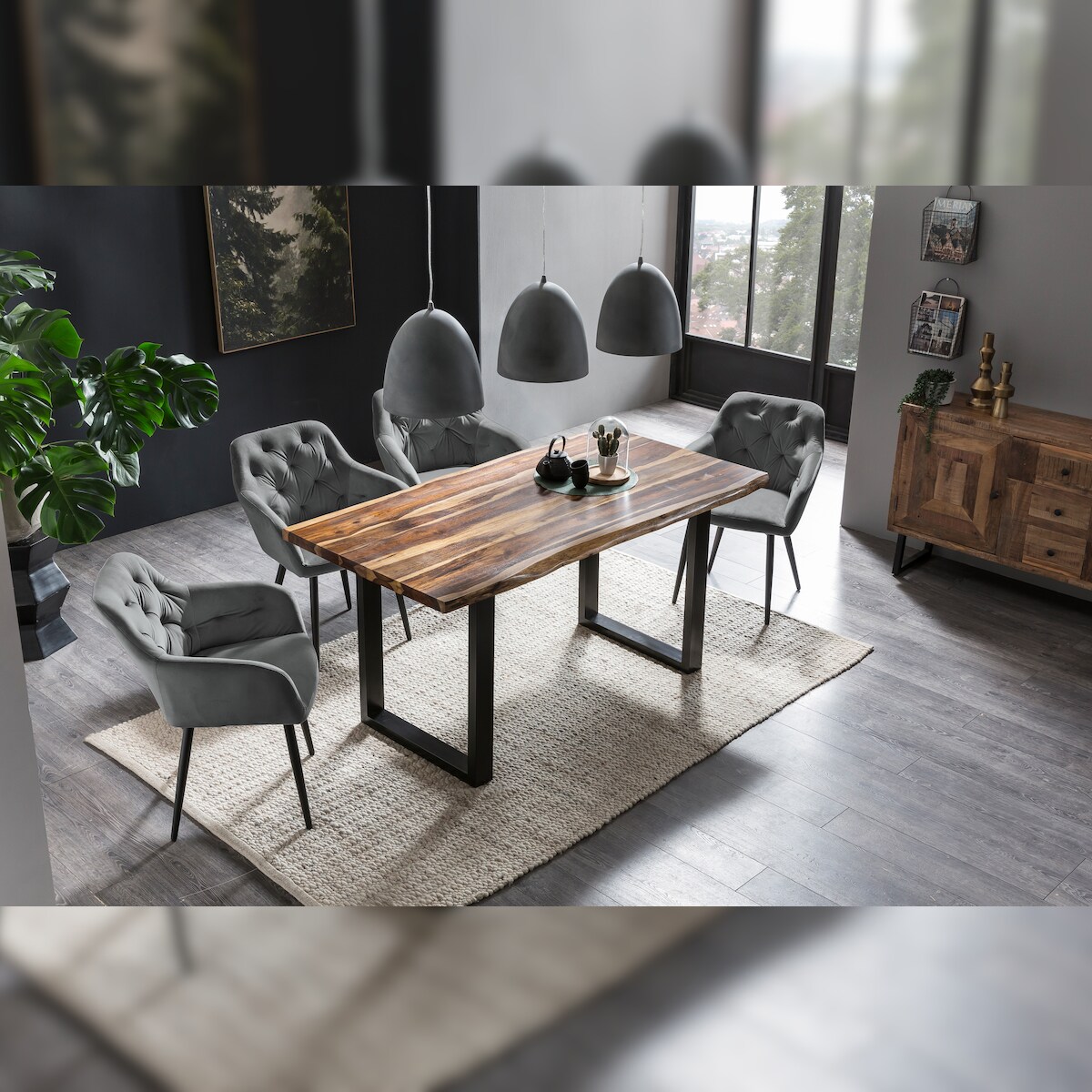 SalesFever Armlehnstuhl | Bezug in Samt-Optik | Gestell Metall höhenverstellbar | Knopfheftung | B 61 x T 45 x H 85 cm | grau – schwarz