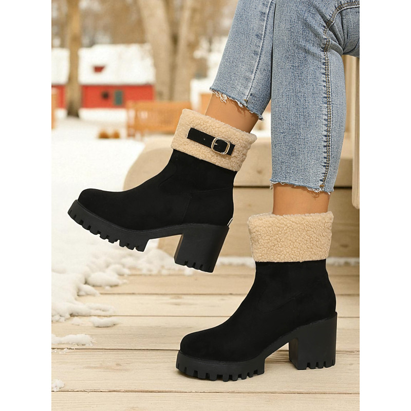 Women's Chunky Heel Winter Boots - Faux Shearling Fold-Over Ankle Boots with Buckle Strap, Warm Non-Slip Fashion Shoes for Casual and Outdoor Wear