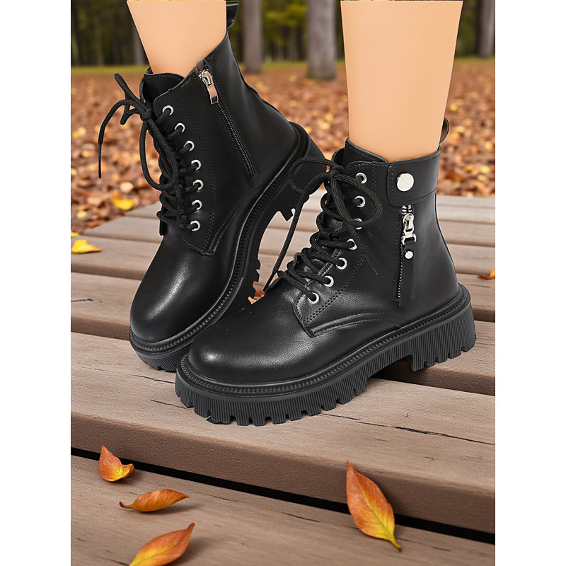 Women's Lace-Up Combat Boots - Chunky Sole Ankle Boots with Side Zipper and Strap Detail for Urban Streetwear and Casual Fashion Outfits