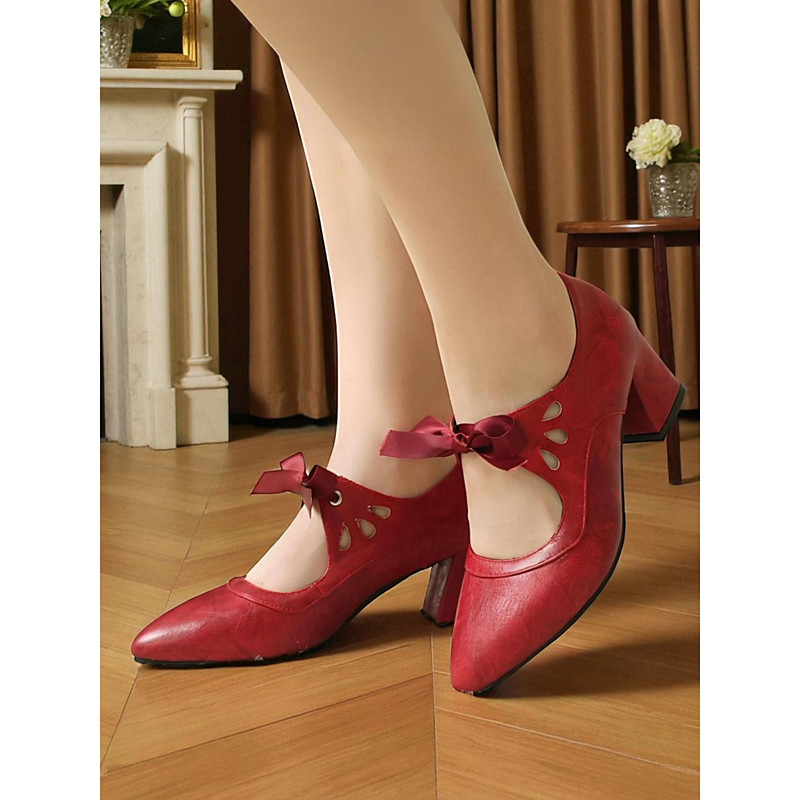 Women's 1950s Style Red Mary Jane Heels with Bow – Retro Cutout Chunky Heel Pumps for Daily Vintage Wear and Swing Dance