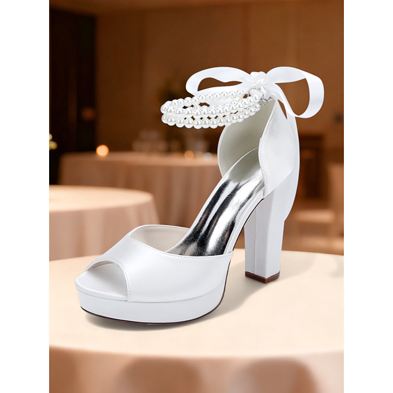 Women's Pink Satin Platform Heels with Pearl Ankle Strap and Bow - Elegant High Heel Sandals for Cocktail Party and Formal Events