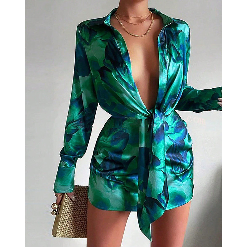 Women's Mini Dress Shirt Dress Print Dress Elegant Fashion Modern Daily Going out Weekend Regular Fit Graphic Long Sleeve V Neck Blue Green Spring Fall Winter