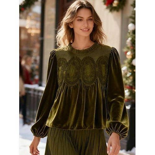 Capodanno Per donna Top con cuciture in pizzo Elegante Manica Lunga Girocollo Top Regolari Quotidiano Ospite di nozze Abbigliamento da sera Ricamato Vino Marrone Verde Autunno Inverno