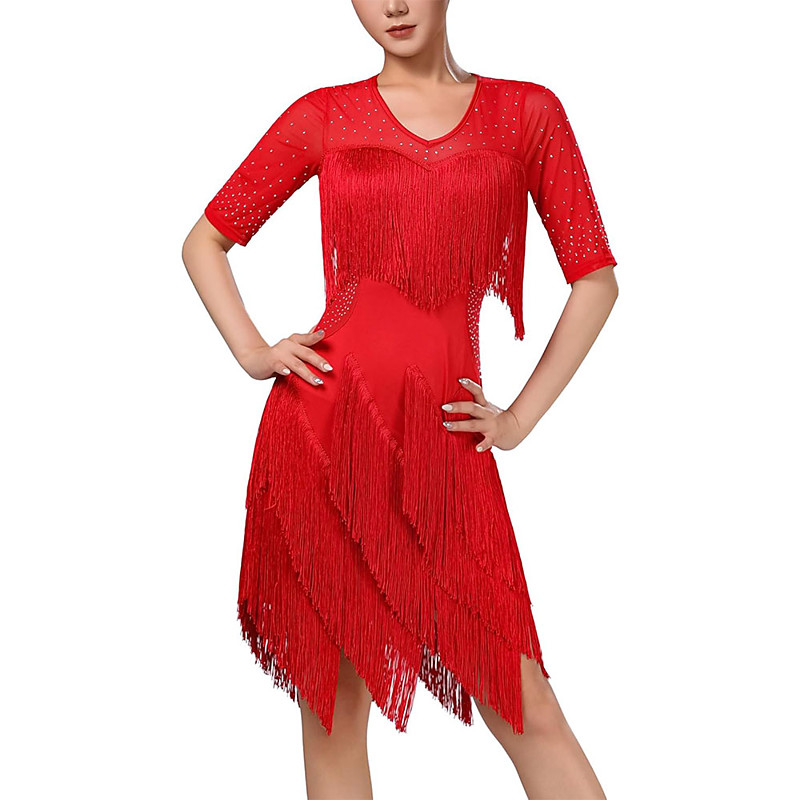 Latin Dance Dress Tassel Splicing Paillette Women's Performance Training Theme Party Short Sleeve 100% Cotton
