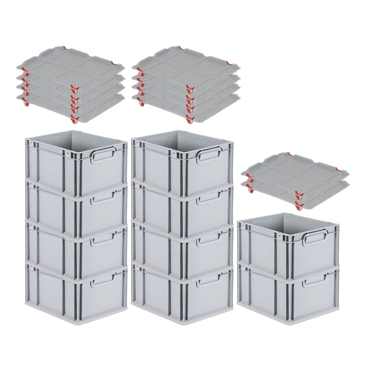 PROREGAL SparSet 10x Eurobox NextGen Grip mit Auflagedeckel & 4 roten Verschlüssen, HxBxT 22x30x40cm, 20L, Grau, Griffe zu, Eurobehälter
