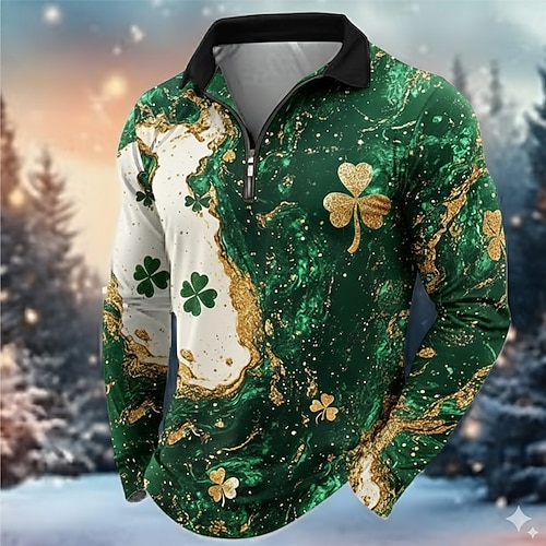 Giorno di San Patrizio Per uomo Trifoglio Marmo Polo Manica Lunga Collo ripiegato Moderno Tempo libero Ferie Casual Quotidiano Festival Cerniera Stampa 3D Primavera Autunno verde 1# Verde 2# Verde 3#