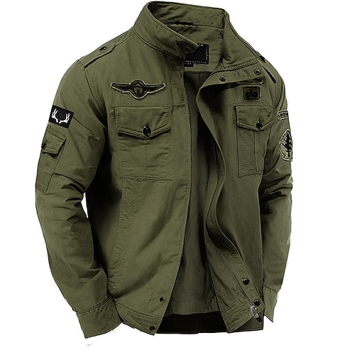 Herren Grafik Rentier Cargo-Jacke Windbreaker Militärjacke Praktisch Lässig Outdoor Campen und Wandern Bestickt Seitentaschen Frontreißverschluss Herbst Winter Stehkragen Langarm Schwarz Kaki