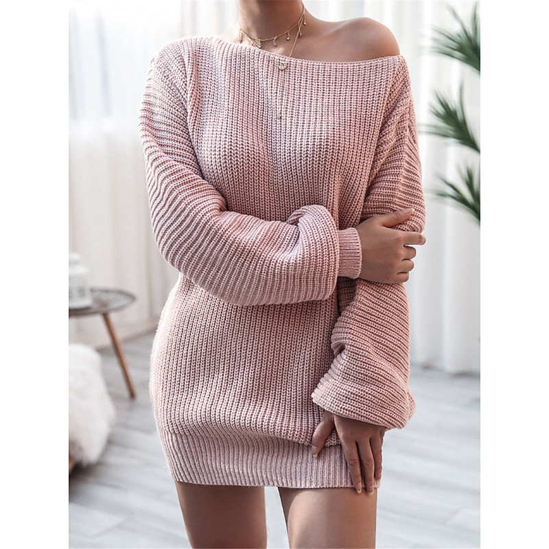 Women's Sweater Sweater Dress Casual Soft Pure Color Ribbed Off Shoulder Knitted Long Sleeve Long Tops Knit Outdoor Daily Weekend White Pink Fall Winter