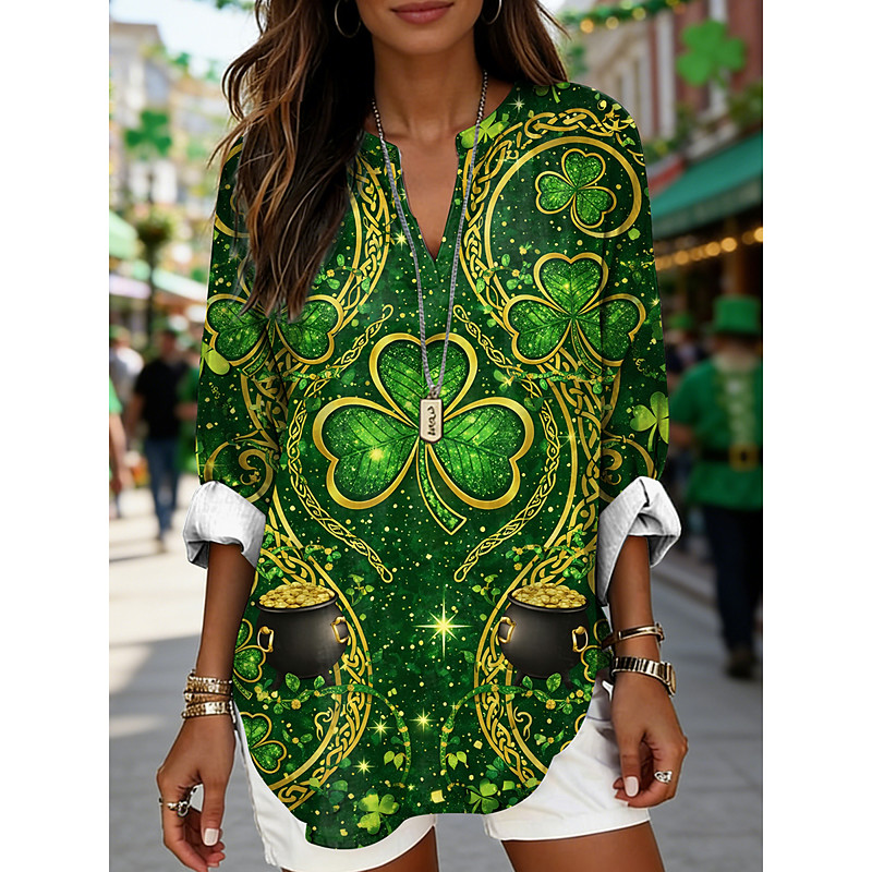 St. Patrick's Day Women's Tunic Blouse Graphic Shamrock Vintage Daily Stylish Long Sleeve V Neck Long Tops Daily Holiday Print Yellow Light Green Green Summer Spring