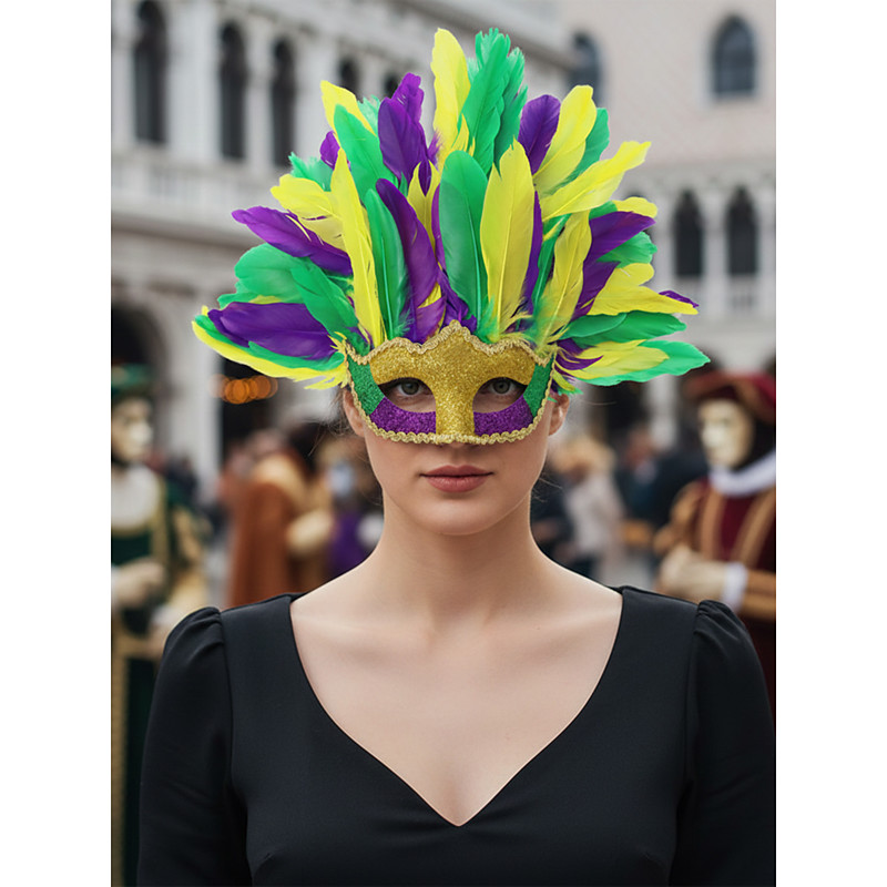 Women's Feathered Venetian Masquerade Mask - Colorful Mardi Gras Style Costume Accessory for Carnival Parties, Cosplay Festive Events