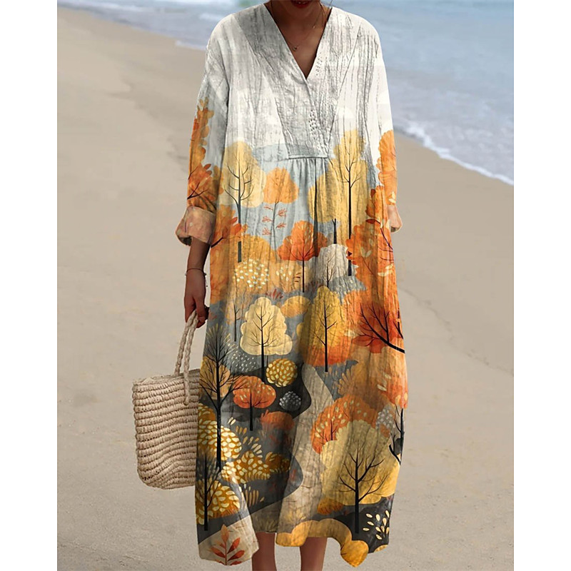 Women's Midi Dress Casual Dress Print Dress Fashion Modern Daily Beach Weekend Regular Fit Tree Long Sleeve V Neck Yellow Blue Orange Dark Blue Spring Fall