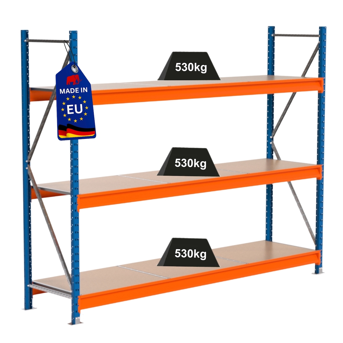 PROREGAL Industrie Schwerlastregal MAXIMUS PRO, Grundregal, HxBxT 200x250x60cm, 3 Ebenen, Spanplatten-Fachboden, Fachlast 530 kg, Blau/Orange