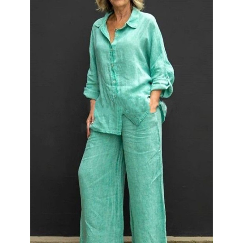 Women's Fashion Streetwear Daily Shirt Cotton Linen Sets Two Piece Sets Wide Leg Pants Long Sleeve V Neck Plain Casual Daily Black White Blue Summer Regular Fit