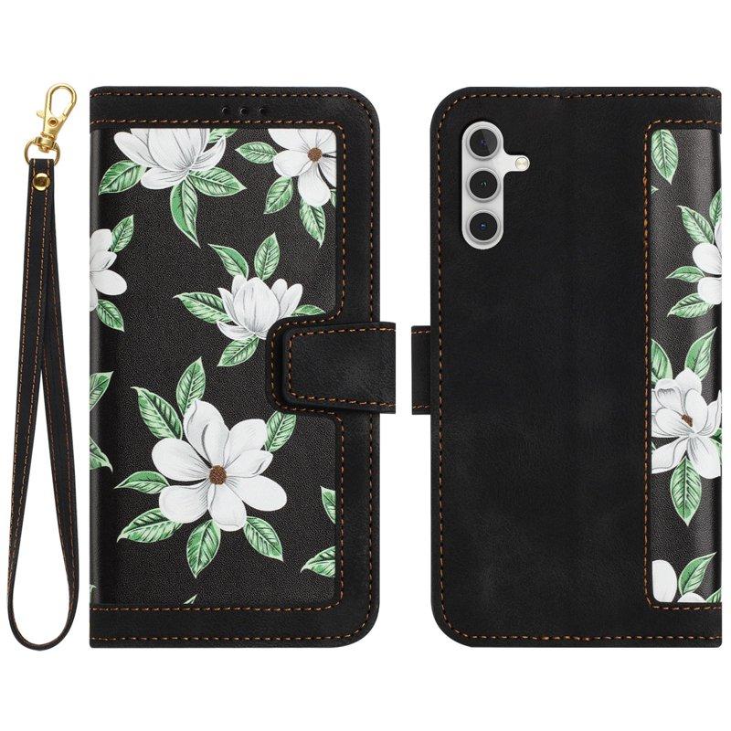 Samsung Galaxy A35 5G Fodral Äkta Läder Ställ Blommönster - Svart