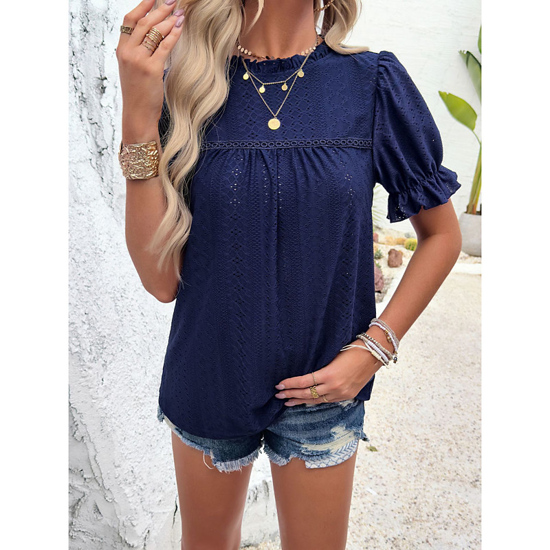 Women's Eyelet Embroidery T Shirts Solid Color Fashion Casual Short Sleeve Puff Sleeve High Neck Regular Tops Daily Going out Vacation Wear Ruched Ruffle Black Dusty Rose Navy Blue Summer Spring Fall
