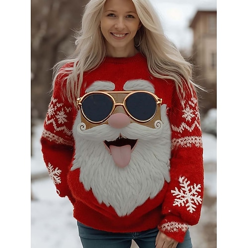 Weihnachtlicher Damenpullover, süßer Streetwear-Look, lässig, mit Weihnachtsmann- und Schneeflockenmotiv, Rundhalsausschnitt, Patchwork-Strickmuster, lange Ärmel, normale Passform, Strickoberteil,