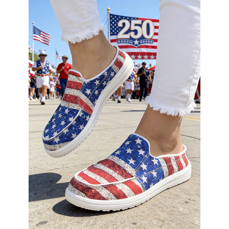 Women's Red Blue American Flag Print Comfort Mules – Canvas Slip-On Shoes for USA 250th Anniversary, Fourth of July, Outdoor Events, Travel Daily Wear