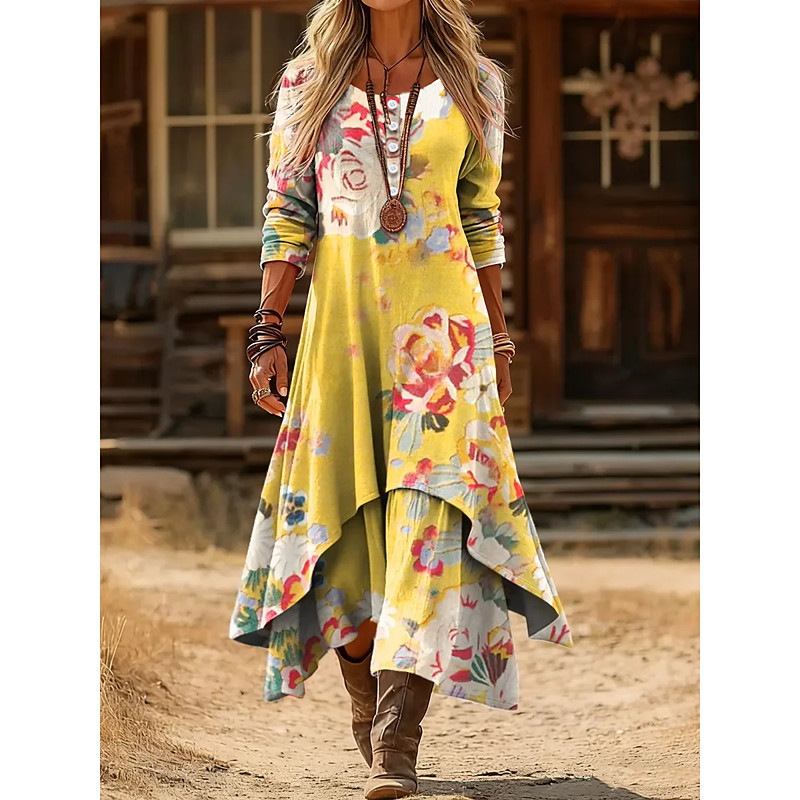 Women's Midi Dress Shift Dress Casual Daily Holiday Regular Fit Floral Graphic Long Sleeve Crew Neck Yellow Purple Fall Winter