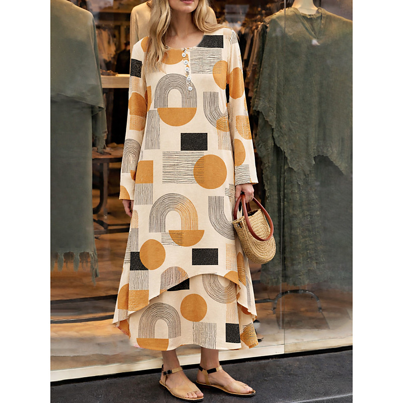 Women's Midi Dress Shift Dress Casual Holiday Loose Fit Graphic Geometric Abstract Long Sleeve Crew Neck Blue Yellow Pink Green Spring Fall Winter