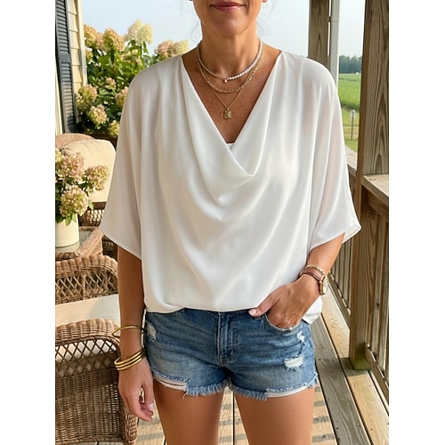 Damenbluse, elegante Oberteile, einfarbig, gerüscht, Fledermausärmel, 3/4-Ärmel, normale Oberteile, Wasserfallausschnitt, für die Arbeit, Alltag, Schwarz, Weiß, Gelb, Rosa, Himmelblau, Sommer,