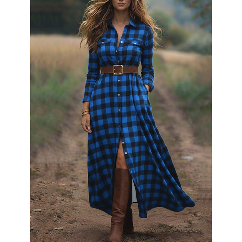Women's Maxi Dress Shift Dress Vacation Casual Boho Daily Regular Fit Plaid Long Sleeve Lapel Blue Red Green Spring Fall