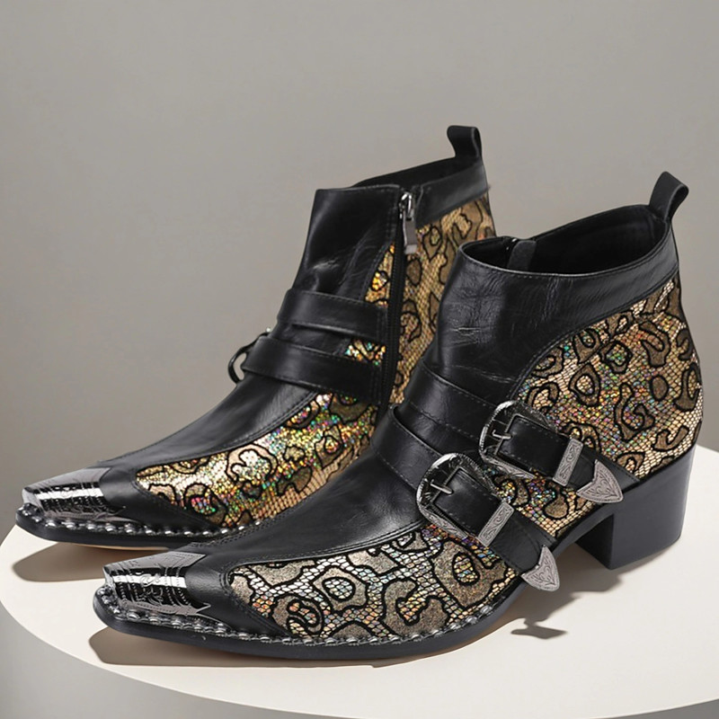 Men's Black and Gold Jacquard Buckle Boots – Vintage Gothic Faux Leather Ankle Shoes for Party, Concerts and Fashion Outfits