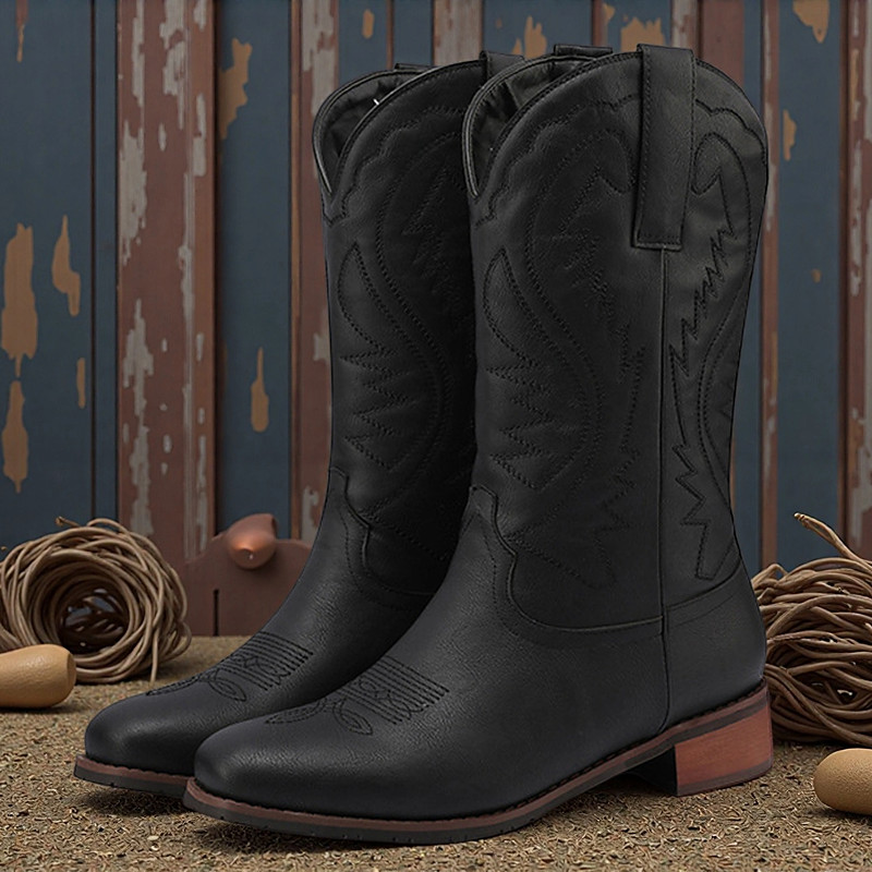 Women's Brown Western Over-the-Knee Boots - Faux Leather Embroidered Cowboy Boots with Pointed Toe and Block Heel for Street Style, Casual Fall Winter Outfits, and Everyday Wear