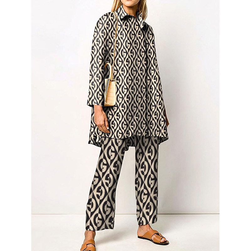 Women's 2 Pieces Elegant Vintage Fashion Shirt Blouse Pants Sets Pants Trousers Long Sleeve Shirt Collar Graphic Print Casual Daily Dark Navy Green Clover Fall Winter Regular Fit