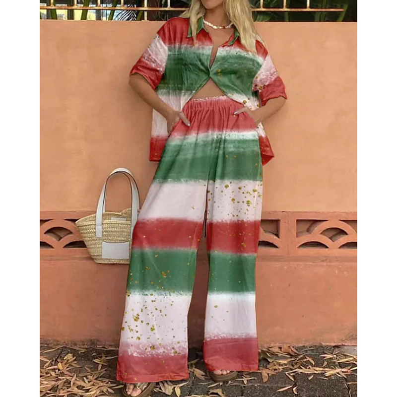 Women's Fashion Streetwear Shirt Linen-Inspired Sets Two Piece Sets Linen Pants Pants Trousers Long Sleeve Shirt Collar Color Block Patchwork Daily Wear Date Pink Red Clover Spring Regular Fit