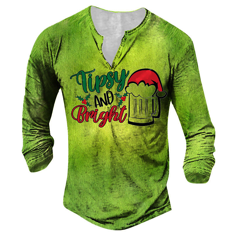 Christmas T Shirt Men's T shirt Tee Henley Shirt Tee Graphic Letter Henley Light Green Green Green / White 3D Print Outdoor Christmas Long Sleeve Button-Down Print Clothing Apparel Designer Basic