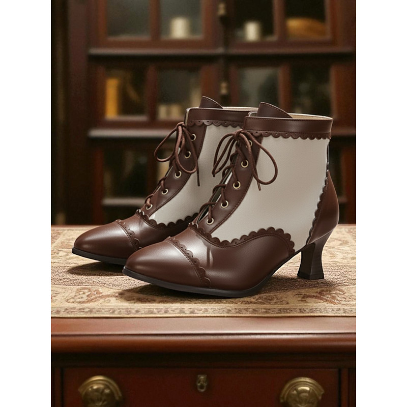 Women's Victorian Lace Up witch Boots with Low Heel, Two Tone Black and White Edwardian 1900s-1910s Style Booties, Vintage Steampunk Gothic Shoes for Cosplay, Parties and Daily Wear
