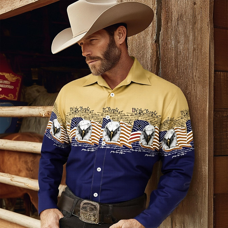 Men's Eagle US Flag America's 250th Anniversary Shirt Western Shirt Cowboy Shirt Long Sleeve Vintage Retro Vacation Holiday Spring Fall Turndown 3D Print Linen Like Shirt Yellow Purple Orange
