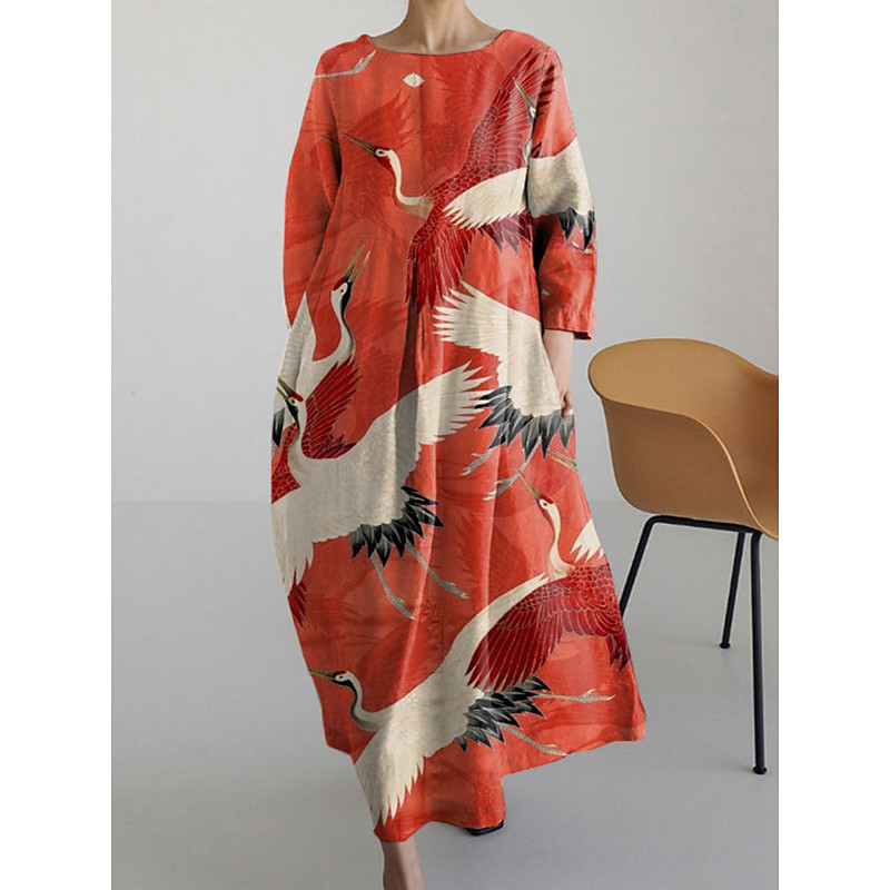 Women's Maxi Dress Faux Cotton Linen Elegant Casual Daily Regular Fit Floral 3/4 Length Sleeve Crew Neck Red Green Summer Spring Fall
