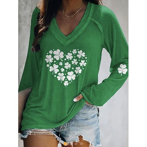Maglietta da donna per il giorno di San Patrizio grafica quadrifoglio alla moda casual a manica lunga scollo a V top regolari stampa quotidiana bianco verde chiaro verde estate primavera