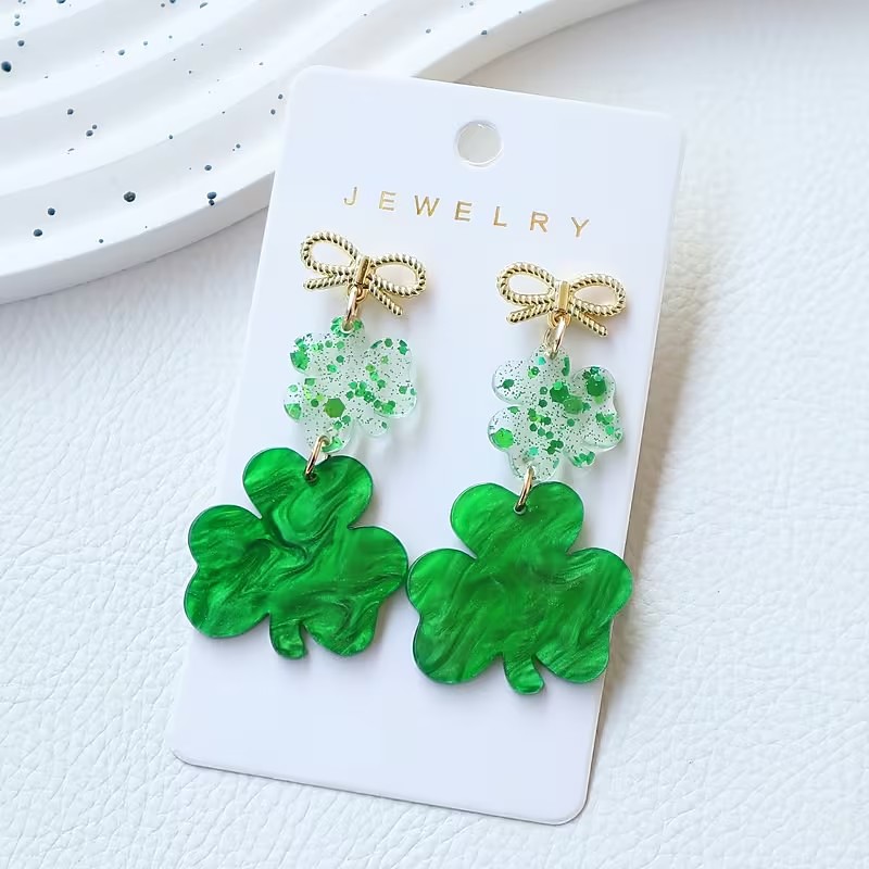 1 Pair St. Patrick's Day Earrings, Green Acrylic Starry Shamrock Earrings with Elegant Bow Studs, Chic Holiday Party Dangle Jewelry