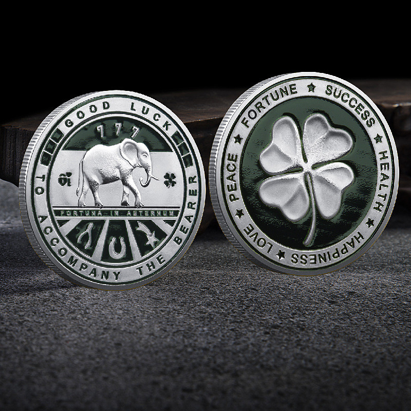 Lucky Challenge Coin with Four Leaf Clover and Elephant Design,St. Patrick's Day Gift Good Luck Gift with 777 Symbols, Pocket Amulet for Protection and Fortune, Collectible Coin with Acrylic Case