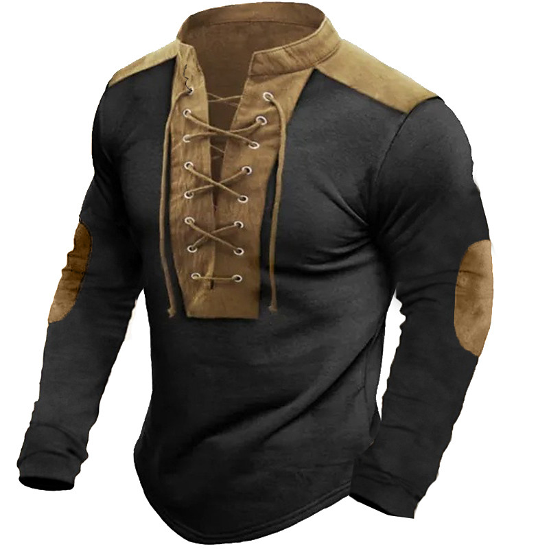 Men's Cotton Linen T Shirt Long Sleeve Standing Collar Henley Summer Spring Fall Plain Basic Rustic Modern Patchwork Drawstring Buttons Home Street Casual Black Gray Green Top Tee for Men